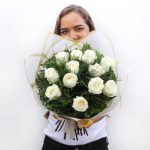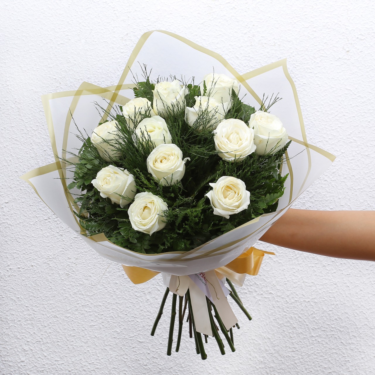 Em até 3x de R$ 233,25 sem juros À vistaR$ 629,78no Pix Composto por 12 Rosas branca, vassourinha e verde samambaia